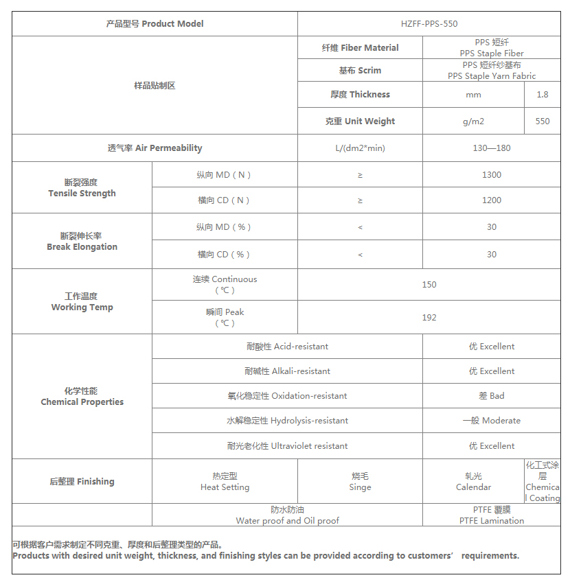 PPS 中文名為聚苯硫醚。本公司所生產(chǎn) PPS 針刺過濾氈的纖維原料來自Procon®(日本 Toyobo) 、Torcon®、 Celanese®、Fortron®(日本 Toray) 、PPS纖維(四川得陽科技股份有限公司)等國內外著名企業(yè),產(chǎn)品具有優(yōu)異的熱穩(wěn)定性和阻燃性,熔點為 285℃,能抗多種酸堿,可在潮濕、化學物質氛圍和高溫條件下使用。PPS對過濾氣體中的含氧量有特殊要求,同時也與使用溫度密切相關。